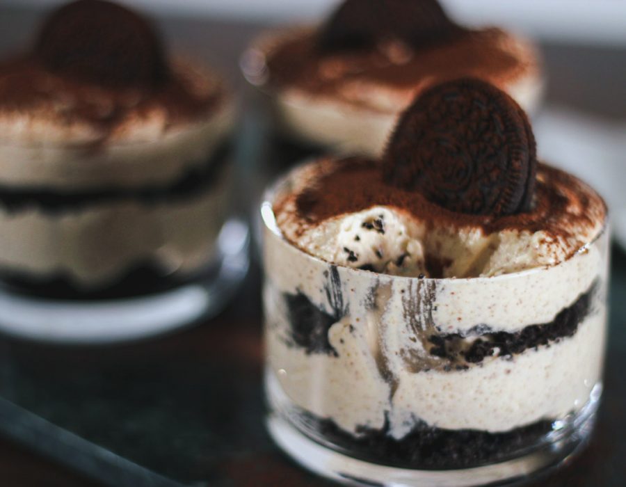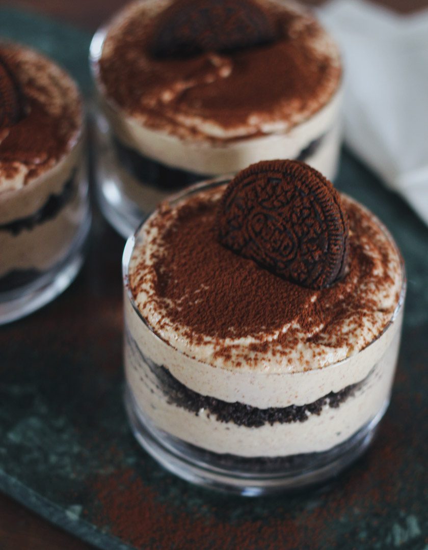 • Krossa oreos riktigt fint, en matberedare är bra att använda här. Blanda samman med smält smör. Fördela hälften av krosset i botten på fyra glas. Lägg över hälften av moussen. Om man har kupade glas kan det vara enklast att spritsa moussen för att inte kladda så mycket. Fördela sedan resterande oreos och därefter resten av moussen. Dekorera med lite kakao och ett oreokex precis innan servering. Det hade också varit gott med lite hackade jordnötter. Moussen går bra att förvara en dag i kylskåp, den blir lite tjockare men är fortfarande lika god!