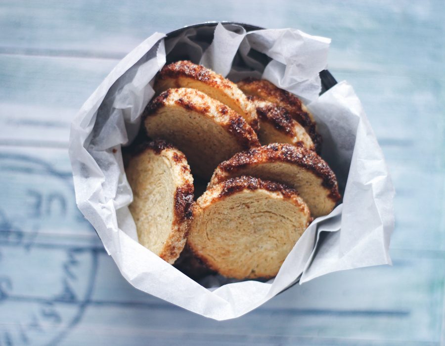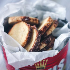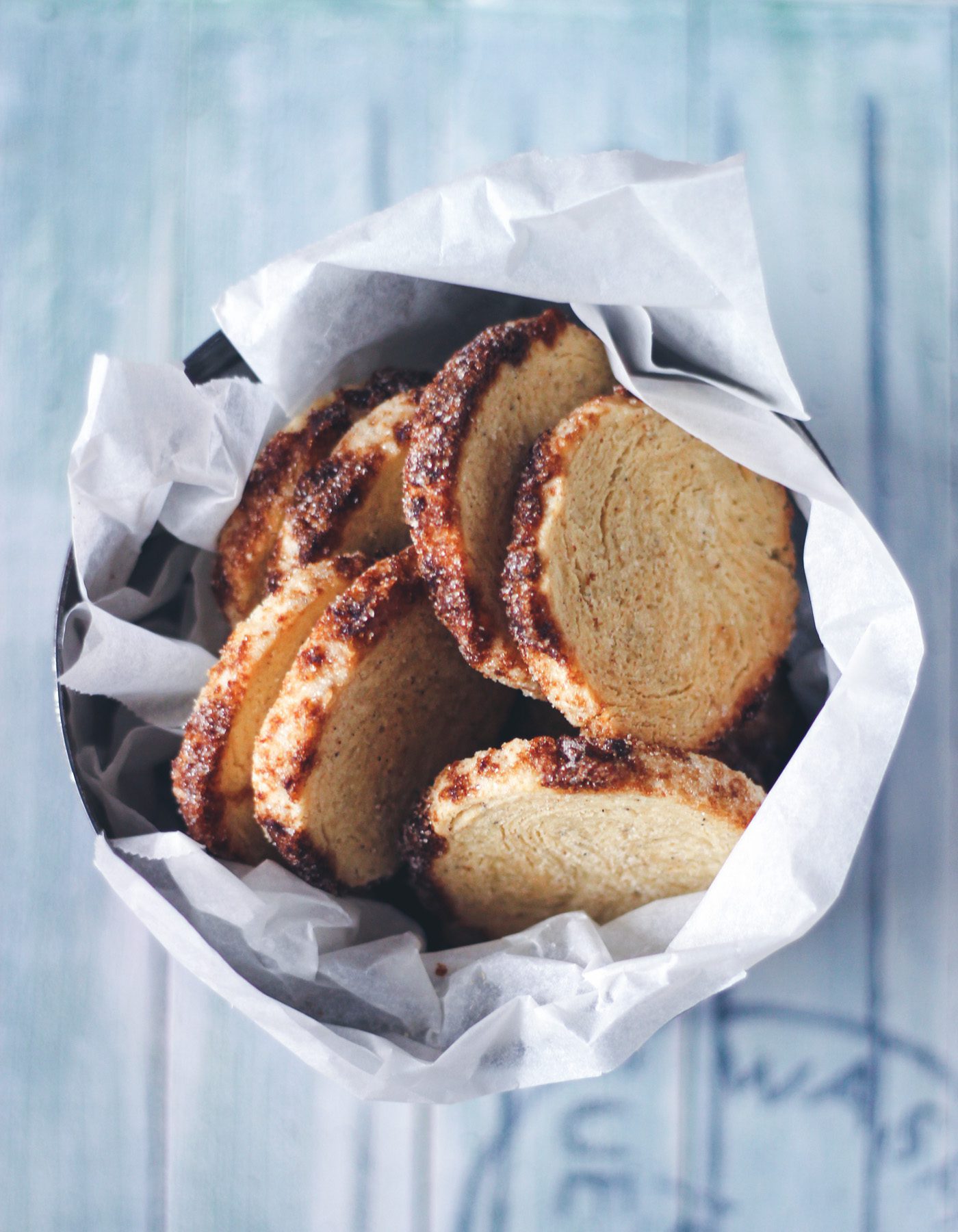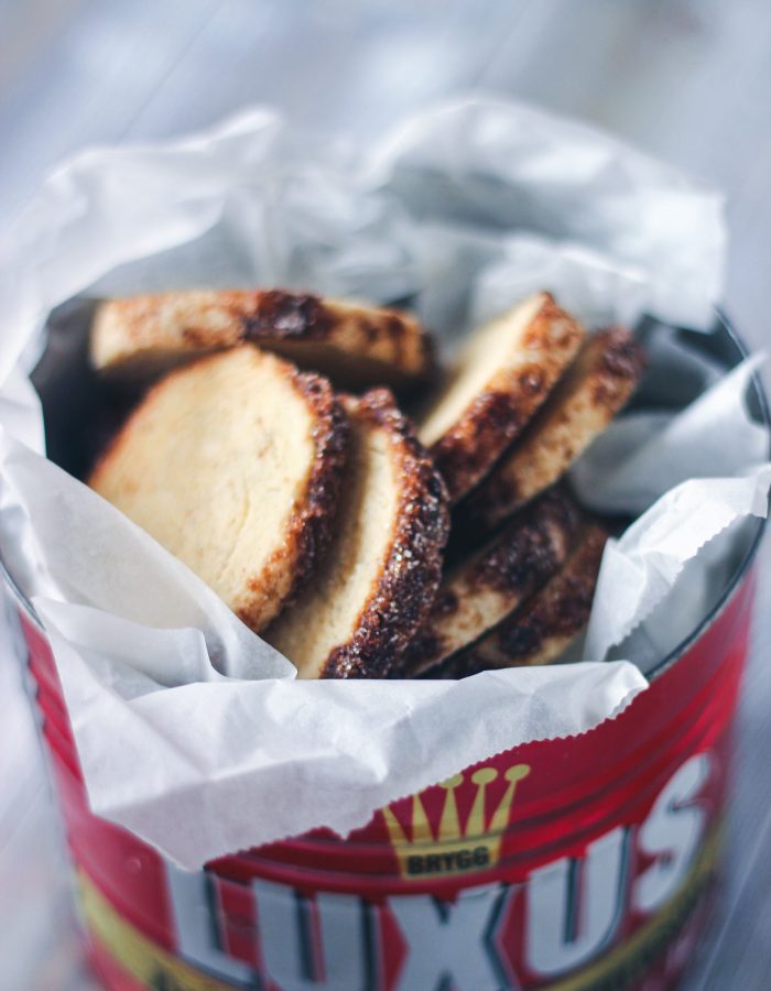 - Dela smöret i små bitar och knåda ihop med de andra ingredienserna till en deg. Rulla till en rulle, cirka 5-6cm i diameter. Mixa socker och muscovadosocker i en mixer. Mixa bara lite lätt så att inte sockerkristallerna går sönder för mycket. Rulla rullen i sockret så att den är helt täckt. Ställ i kylskåpet en stund så degen hårdnar lite. När den gjort det, skär rullen i 1cm tjocka skivor, receptet räcker till cirka 30st kakor. Lägg kakorna på plåten, lägg ändarna med den skurna sidan upp. Grädda i 175 grader i ca 10minuter. Lått kallna på galler.